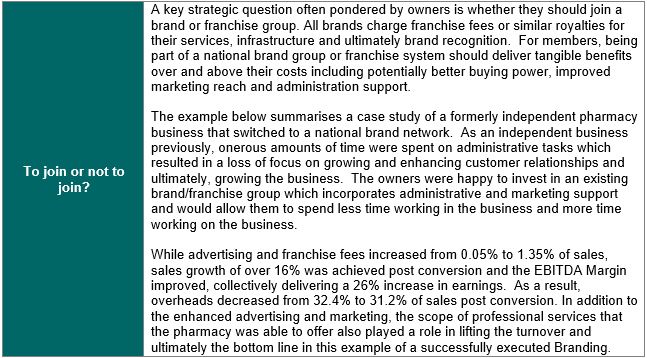The case studies explored above illustrate that there isn’t a one size fits all approach to branding in the pharmacy industry and, critically, highlight the importance of firstly setting, and subsequently regularly reviewing branding strategies. Making the right brand decision comes down to being diligent with analysis, staying true to your situation and utilising an external review process to remove historical bias from decision making.